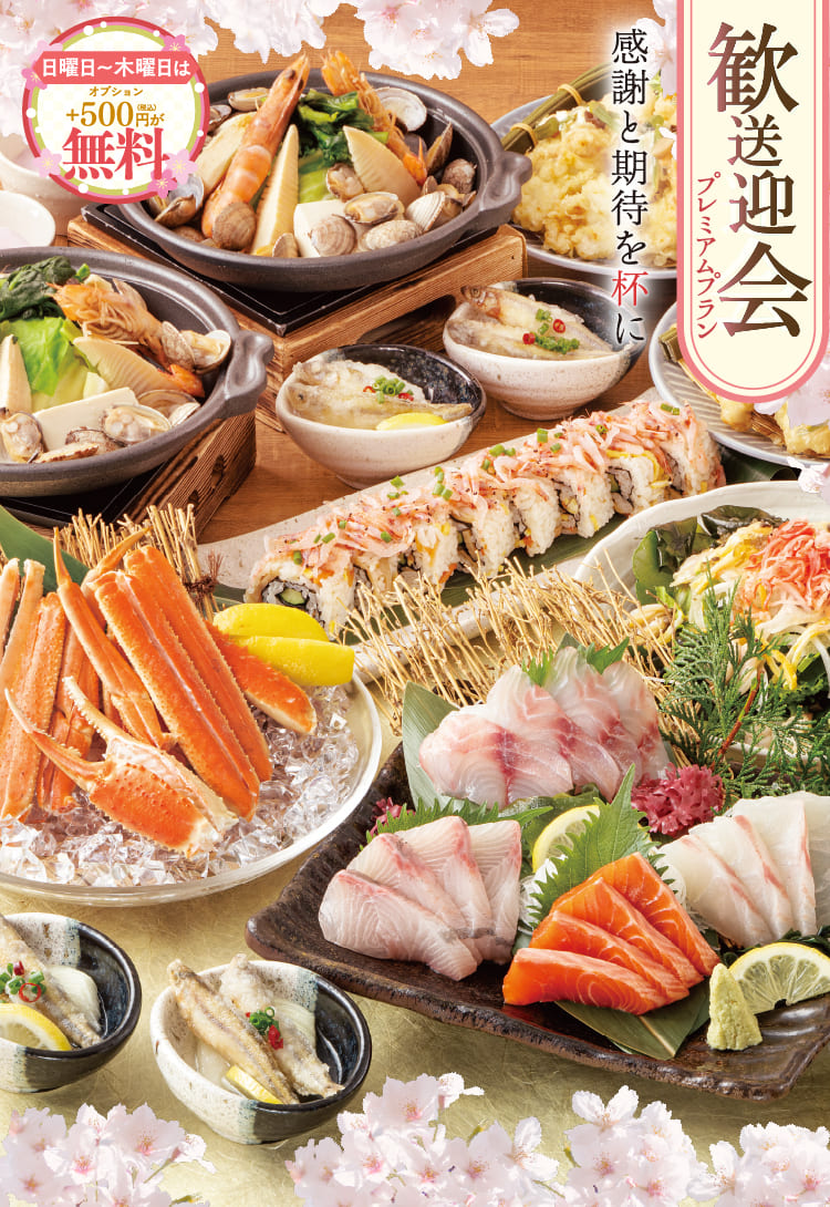 【主役が喜ぶ宴会に◎選べる予約特典付】本ズワイ蟹or黒毛和牛等のメインに、菜の花や桜えびが春の彩りを添えるコース「歓送迎会プレミアム」が4500円~